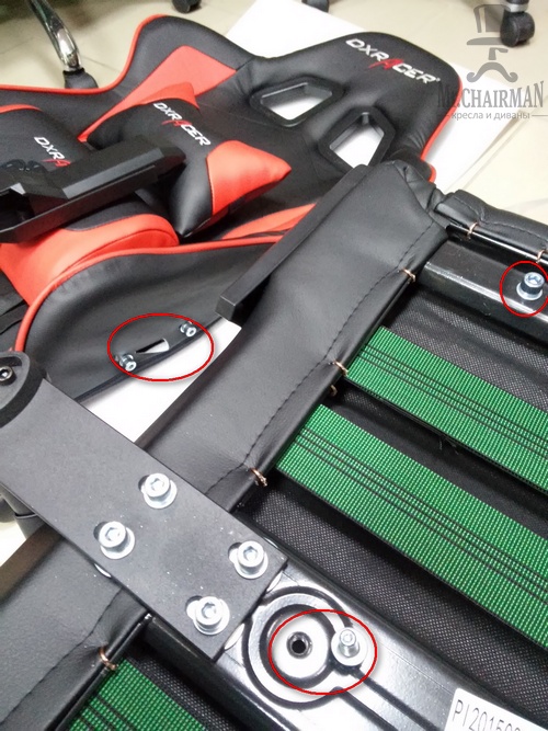 2. Крепим механизм качания топ-ган №2 к сидению кресла. Крепежные болты не лежат в комплекте, они вкручены в свои посадочные отверстия на сидении и спинке кресла. Выкручиваем болты из сидения и крепим механизм. С каждым крепежным болтом в комплекте идет гайка и гровер. Стоит отметить, что гровер располагается между металлической шайбой и шляпкой болта, для надежного прижима и устранения само откручивания. Сидение устанавливаем на газлифт.