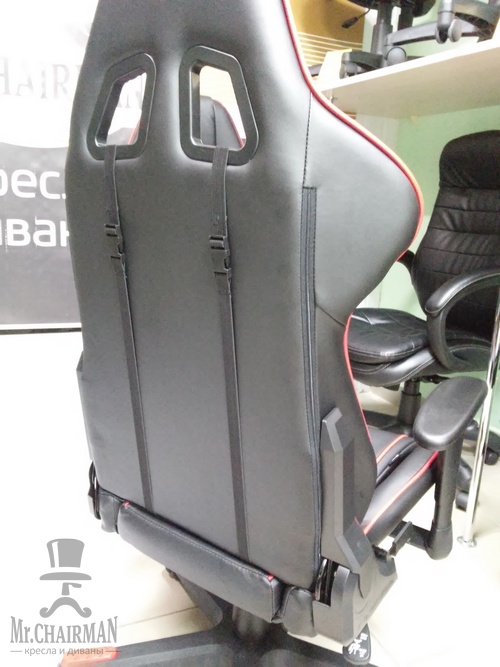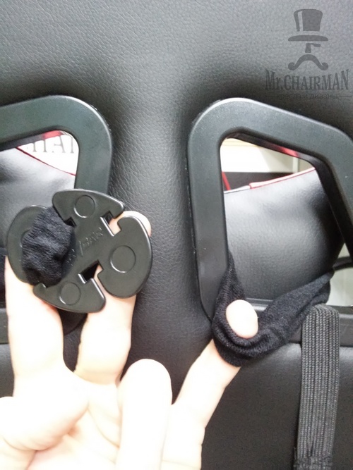 4. Кресло практически собрано, осталось закрепить поясничную подушку и подушку подголовник. Поясничная подушка крепиться эластичными лентами на защелки. Подушка подголовник - специальным зажимом, а если рост сидящего позволяет, подушку можно просто одеть сверху.