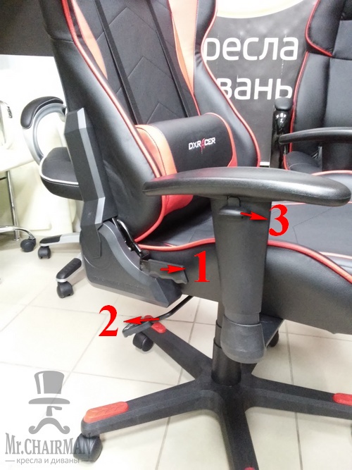 Рассмотрим регулировки кресла: 1-регулировка изменения угла наклона спинки кресла вплоть до 135 градусов и фиксация в любом положении. 2-регулировка механизма качания топ-ган №2 подробно рассмотрена в нашей статье. 3-регулировка высоты подлокотников и фиксация в любом положении.